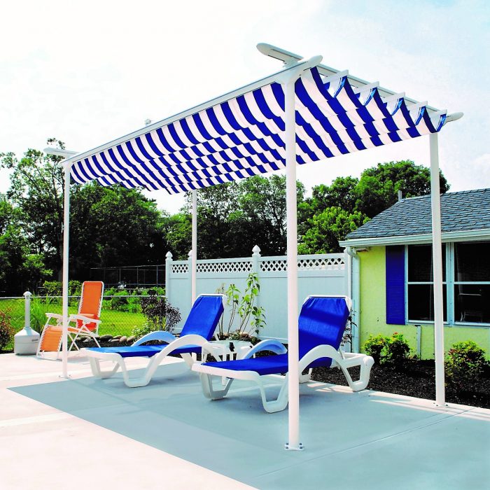 • Frame Construction: Constructed of 6063 T5 aluminum extrusions, powder coated in white and features an aluminum head box/ cassette for fabric storage. Each outrigger (minimum of 2 per unit) is fitted with an internal gas filled strut which applies outward pressure keeping the fabric taut in virtually all conditions. The 2” x 2.5” aluminum extruded posts and cross member are fitted to cast aluminum fittings and incorporate stainless fasteners to ensure a long trouble free life.